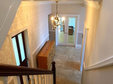 All trim work in Satinwood. Two tone Matt Laura Ashley Paint an feature wall in Laura Ashley paper.